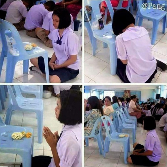 Nữ sinh quỳ lạy bên chiếc ghế trống vào Ngày của Mẹ năm ngoái. Ảnh: Coconut.
