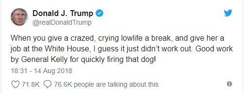 Ông Trump viết trên Twitter hôm 14/8 chỉ trích nặng nề cựu trợ lý Nhà Trắng Omarosa Manigault Newman, người đã công bố đoạn ghi âm cuộc gọi giữa hai người sau khi Omarosa bị buộc thôi việc trong một chương trình của NBC hôm 13/8.
