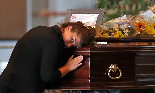 Người thân trước quan tài một nạn nhân trong vụ sập cầu tại Genoa ngày 17/8. Ảnh: AP.