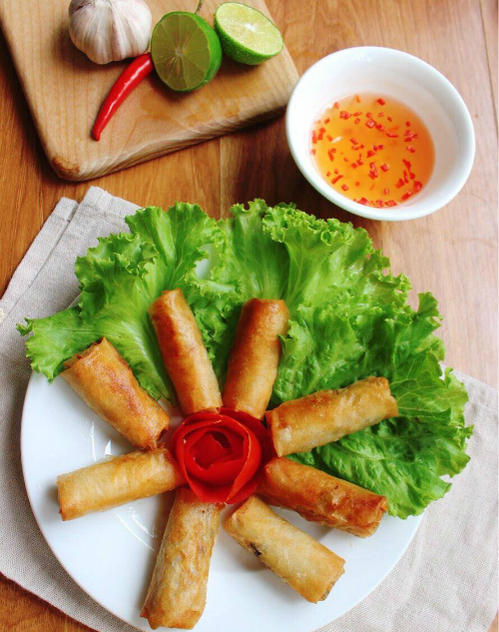 Nem nhân tôm thịt thơm giòn làm khôn ghề khó chút nào. Chả giò nhân tôm ăn cùng rau sống và nước chấm chua ngọt ngon tuyệt cú mèo. Chỉ sau một thời gian ngắn, chúng ta đã có đĩa nem màu vàng nâu và vỏ giòn tan cùng nhân tôm thịt nóng hổi.