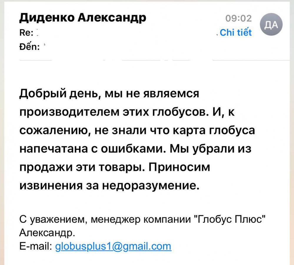 Xin chào! Chúng tôi không phải là nhà sản xuất những quả địa cầu này. Và chúng tôi rất lấy làm tiếc khi không biết bản đồ in trên quả địa cầu bị sai. Chúng tôi đã gỡ các sản phẩm này khỏi trang bán hàng trực tuyến. Chúng tôi thực sự xin lỗi vì gây ra sự hiểu lầm này’.