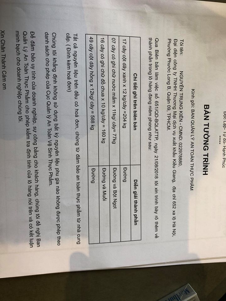 Ngày 23-8-2018, Kiều Giang đã nộp đầy đủ hoá đơn chứng từ trước của những nguyên liệu này. Thậm chí, có cả người của công ty cung cấp xác thực, như: bột ngọt Ajinomoto, sản phẩm muối tinh của Tập đoàn muối miền Nam, đại lý cung cấp đường của Công ty đường Vị Thanh....