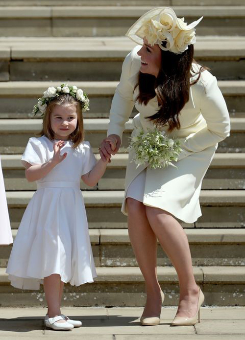 Cách đây khoảng 3 tháng, trong đám cưới của Hoàng tử Harry và Meghan Markle, Kate và Charlotte là cặp đôi hoàn hảo với trang phục màu trắng. Vòng hoa trên đầu công chúa và chiếc mũ lệch của công nương càng khiến hai người nổi bật hơn khi đứng cạnh nhau.