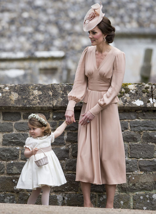 Khi tham dự lễ cưới của em gái ruột Pippa Middleton, Kate mặc một chiếc váy dài màu hồng nude thanh lịch cùng mũ hoa đội đầu tinh tế. Trong khi đó, tiểu công chúa đội vòng hoa, diện váy baby doll màu trắng với điểm nhấn là đai quấn cùng màu với váy của mẹ.