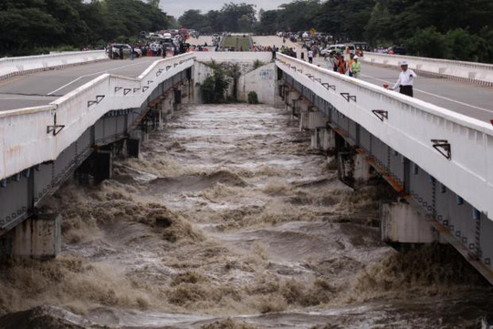 Nước từ một con đập bị vỡ tràn vào các khu vực ở miền Trung Myanmar hôm 29-8, chặn một phần đường cao tốc nối liền các thành phố Yangon, Mandalay và Nay Pyi Taw. Ảnh: Reuters