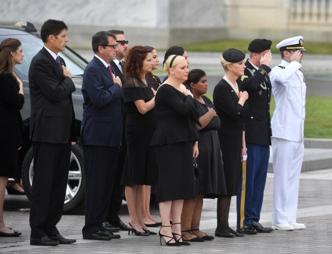 Gia đình ông McCain đặt tay lên ngực khi đội danh dự đưa linh cữu ông từ tòa nhà Quốc hội Mỹ đi ra.