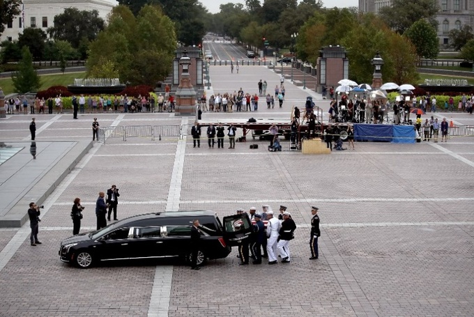 Xe chở linh cữu ông McCain bên ngoài Nhà thờ Quốc gia.