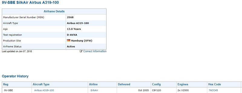Theo tìm hiểu của phóng viên, chiếc Airbus A319 có xuất xưởng (MSN) 2568 hiện đang được khai thác bởi hãng hàng không SilkAir (Singapore). Chiếc Airbus này có chuyến bay đầu tiên vào khoảng tháng 10/2005. Như vậy, chiếc máy bay này khoảng 13 năm tuổi.
