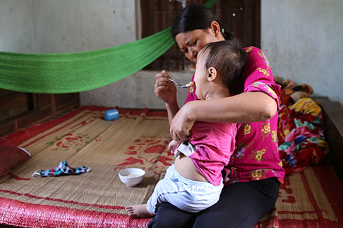 Chị Hồng chăm sóc con gái út 3 tuổi bị bãi não. Ảnh: Nguyễn Hải.