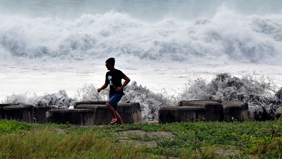 Trong ảnh, một người đàn ông bỏ chạy khi sóng lớn ập vào bờ biển miền Đông Đài Loan trong lúc bão Mangkhut tiến gần hòn đảo này.