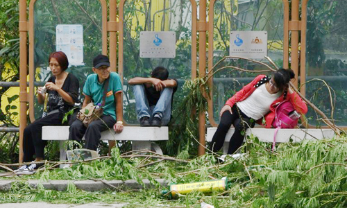 Người dân ngồi chờ phương tiện công cộng sau bão Mangkhut hôm nay tại Hong Kong. Ảnh: AFP.