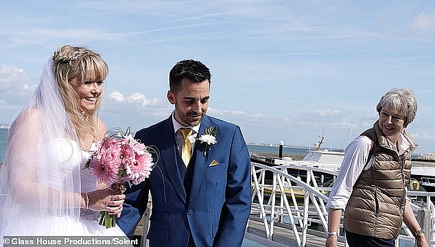 Thủ tướng Anh Theresa May chụp ảnh cùng cặp vợ chồng mới cưới. (Ảnh: Solent)