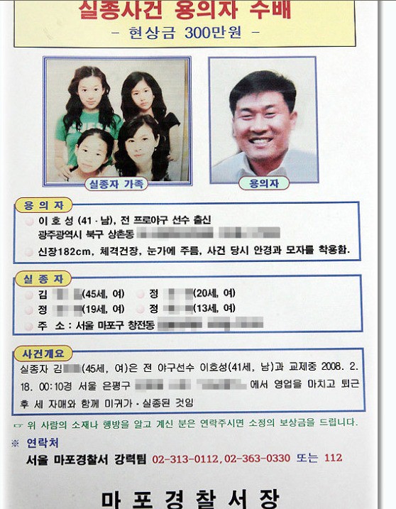 Lâu không thấy 4 mẹ con Kim trở về, gia đ́nh cô cảm thấy bất an và báo cảnh sát. Sau khi nhận được tin báo, người đầu tiên bị đưa vào diện t́nh nghi không ai khác chính là Lee, hắn được cho là cũng biến mất không dấu vết từ giữa tháng 2 đến nay. Cảnh sát sau đó đăng tin t́m 4 mẹ con Kim và bên cạnh là h́nh của nghi phạm giết người họ Lee, kèm theo giải thưởng hơn 60 triệu đồng cho ai cung cấp được thông tin về nơi trú ẩn của hắn.