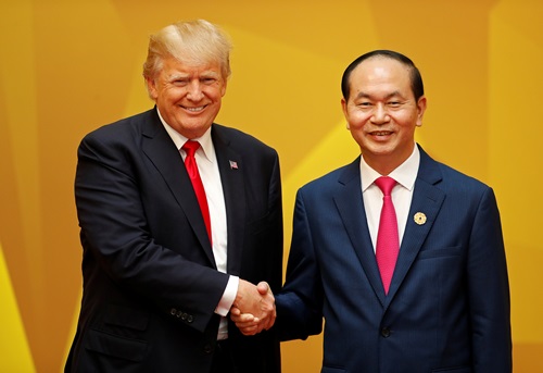 Chủ tịch nước Trần Đại Quang (phải) bắt tay Tổng thống Mỹ Donald Trump tại hội nghị APEC ở Đà Nẵng tháng 11/2017. Ảnh: Reuters.
