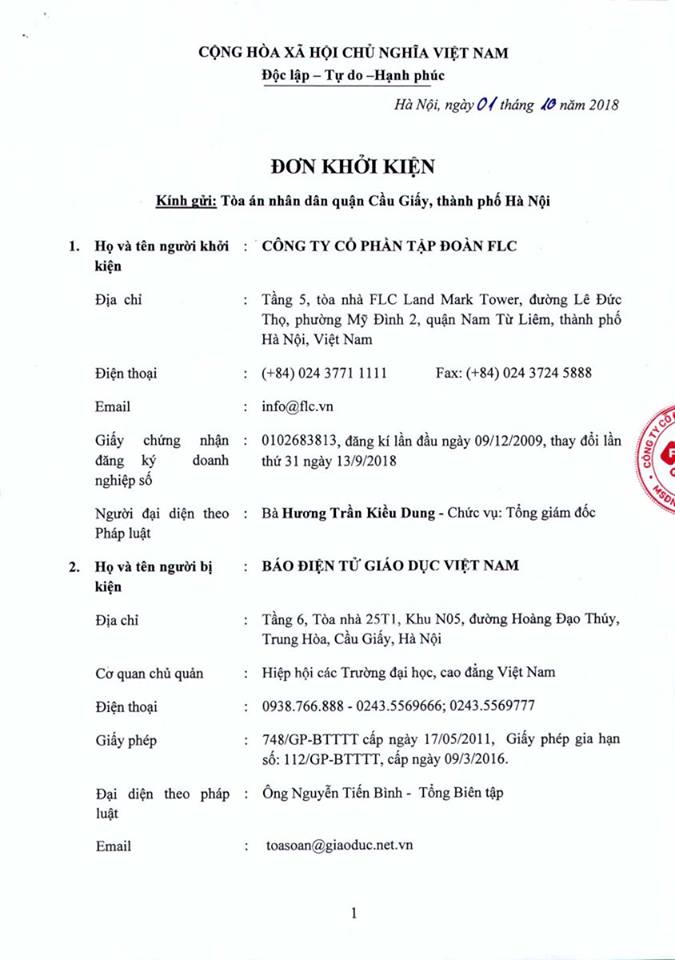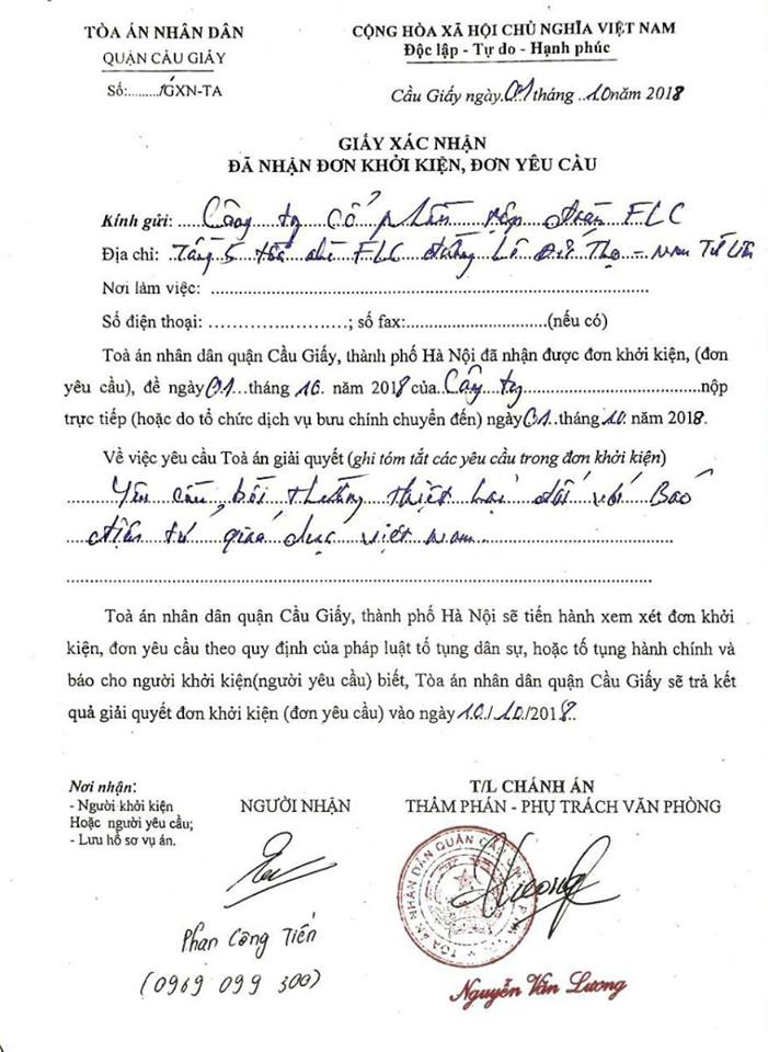 Đơn khởi kiện của Tập đoàn FLC đã được Tòa án nhân dân quận Cầu Giấy chính thức tiếp nhận trong ngày 1/10/2018.