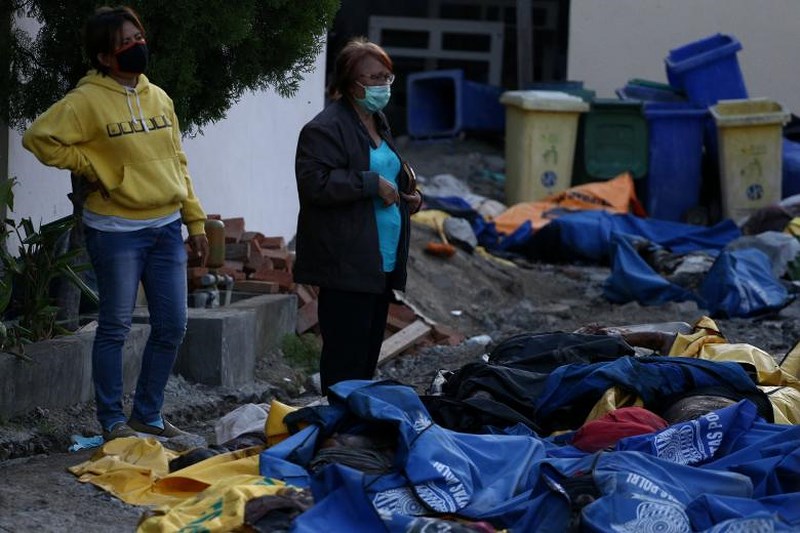 Cảnh tượng kinh hoàng, khi nhiều người tìm kiếm, mở từng bọc thi thể để nhận dạng người thân trong sự đau khổ tột cùng. Ảnh: EPA