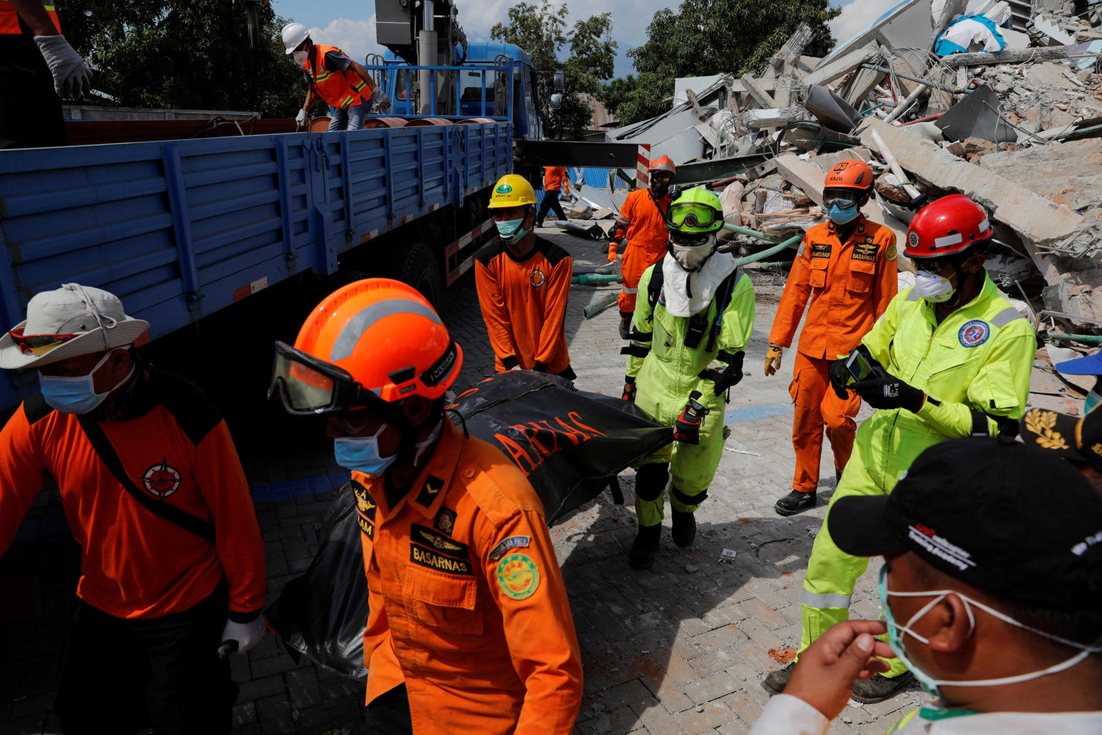 Nhân viên cứu hộ đưa thi thể nạn nhân ra khỏi khách sạn Roa-Roa bị sập trong động đất ở Palu. Ảnh: Reuters.