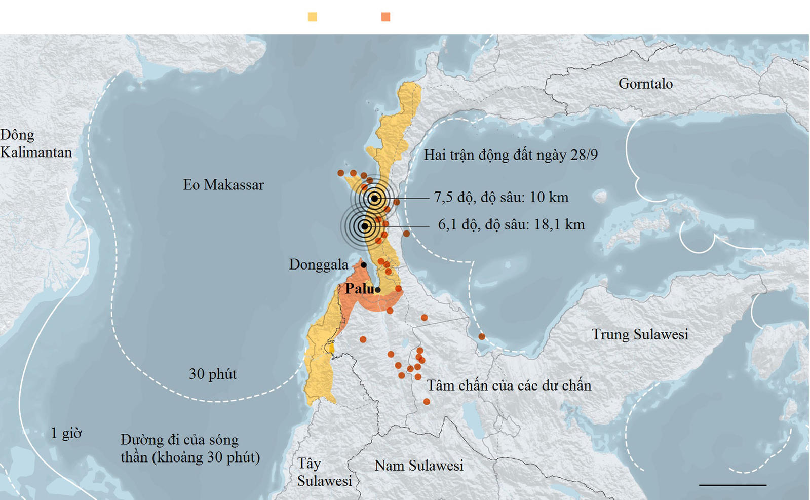 Sóng thần ập vào thành phố Palu chỉ 30 phút sau trận động đất 7,5 độ. Đồ họa: Reuters.
