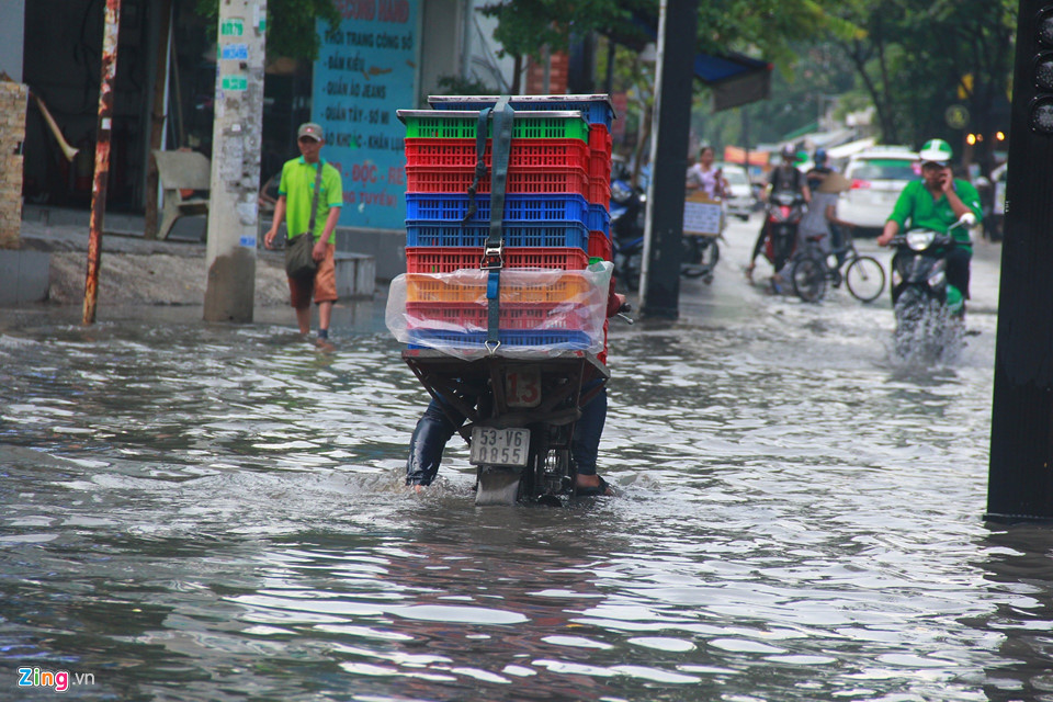 Bà Ngô Thị Vân, ngụ phường Thảo Điền, quận 2, cho biết: "Tôi đi ra chợ gần đây, nhưng nước ngập sâu quá, phải để xe máy ở lại trên vỉa hè, lội bộ về".