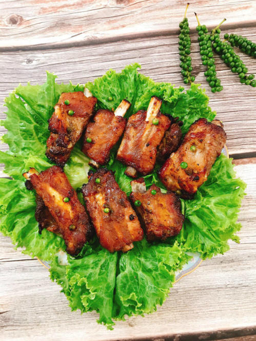 - Sườn thấm đem nướng trên bếp than cho chín hoặc nướng bằng lò. Sườn nướng tiêu xanh ăn với cơm hay đồ nhắm trong các buổi tiệc nhỏ.