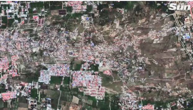 Một đoạn video tổng hợp những hình ảnh được ghi lại từ vệ tinh cho thấy làng Balaroa và Petobo ở ngoại ô thành phố Palu, tỉnh Trung Sulawesi, Indonesia bị xóa sổ trong thảm họa động đất, sóng thần hôm 28/9, theo Sun.