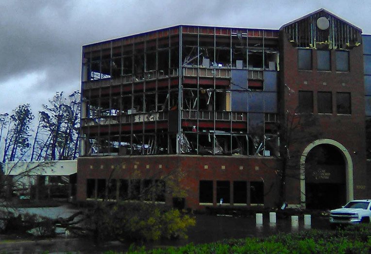 Gió bão đã hủy hoại nhiều tòa nhà cao tầng kiên cố, kể cả Ngân hàng liên bang thứ nhất và bệnh viện Sacred Heart ở bang Florida. Bệnh viện nói họ sắp dùng hết máy phát điện và phải di chuyển các bệnh nhân tới những khu vực an toàn bên trong cơ sở.