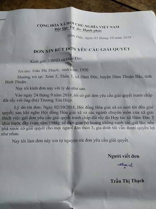 Tất cả vì bà con nhân dân mà nó ép người ta phải rút đơn khiếu kiện, nếu không rút sẽ ảnh hưởng tới con em đang công tác trong cơ quan, trường học.