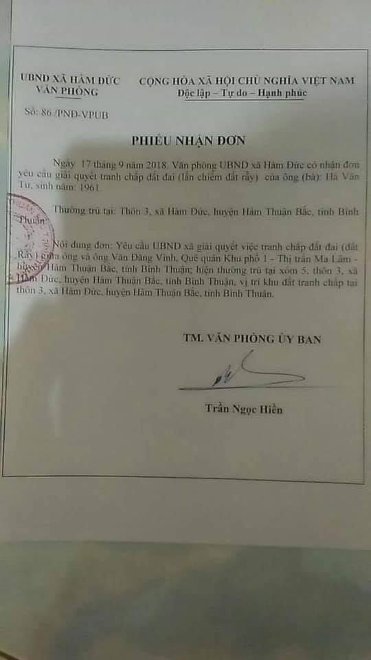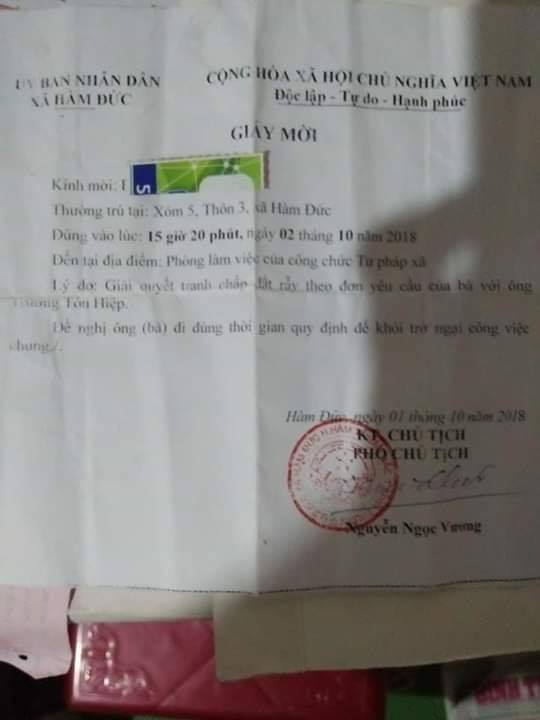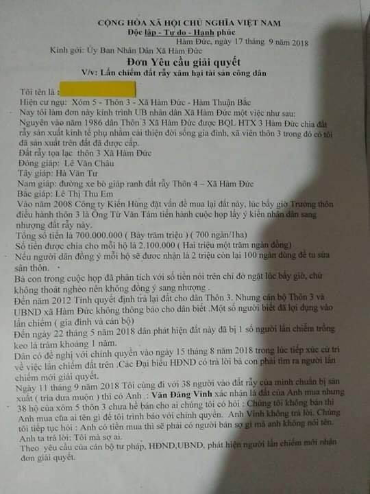 Nơi thường trú: Xóm 5 - Thôn 3 - Xã Hàm Đức là người đã lấn chiếm đất của tôi ( trong có có 38 hộ giống tôi)
