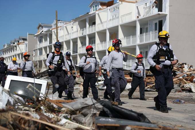 Đội cứu hộ và người dân đi dọc con phố chính ở thành phố Mexico Beach, Florida.