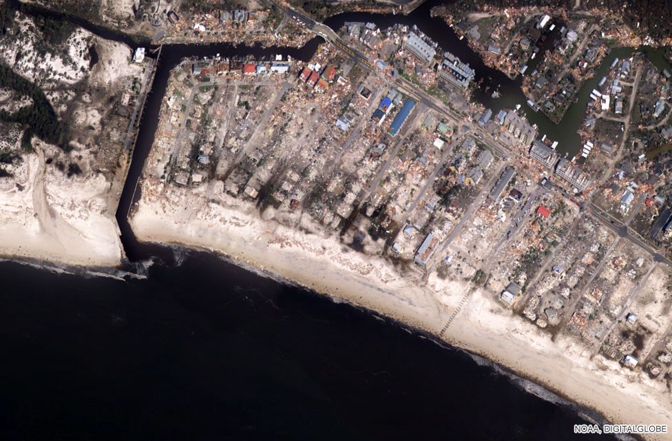 Gió to cùng với sóng lớn đã làm đổ sập và cuốn trôi nhiều nhà cửa ven biển ở thị trấn Mexico Beach. Ô tô và các mảnh vỡ trôi nổi trong nước lũ trong khi nhiều tàu thuyền xô vào nhau, hư hại nghiêm trọng.