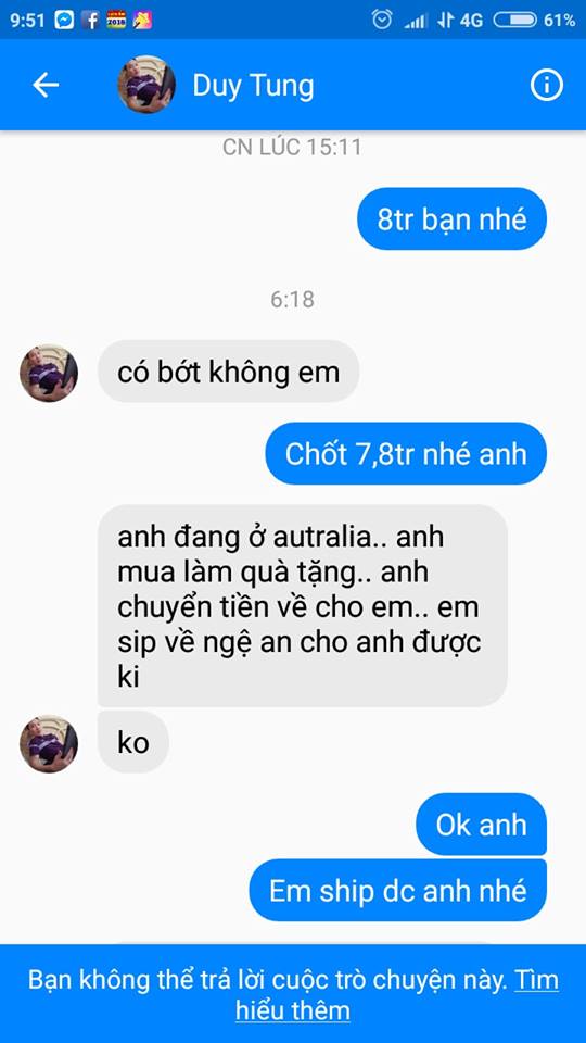 Ảnh chụp màn hình quá trình nick Duy Tùng thực hiện hành vi lừa đảo với anh Hoang Cao Phuong:
