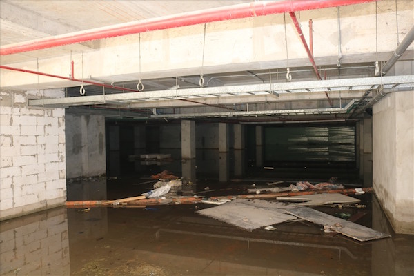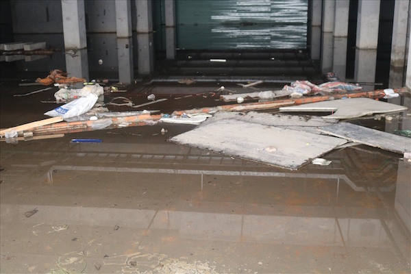 Tầng hầm của công trình cũng ngập sâu trong nước và rác trôi lênh láng khắp nơi.