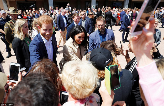 Trong ngày thứ 2 của chuyến công du kéo dài 16 ngày tại Australia, Hoàng tử Harry và Công nương Meghan đã gặp gỡ hàng nghìn người hâm mộ. Một ngày trước đó, Điện Kensington tại London thông báo Meghan đang mang thai con đầu lòng và em bé dự kiến chào đời vào mùa Xuân năm 2019. (Ảnh: Reuters)