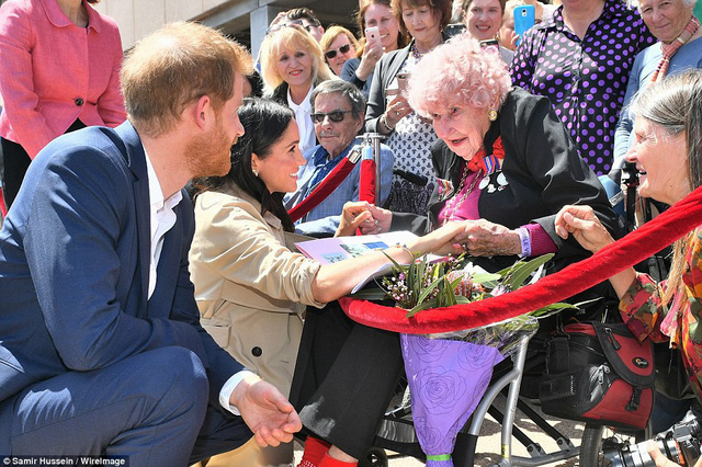 Công nương Meghan cùng chồng trò chuyện với một người hâm mộ đặc biệt, bà Daphne Dunne, một góa phụ 98 tuổi, bên ngoài nhà hát Opera Sydney. (Ảnh: Wire)