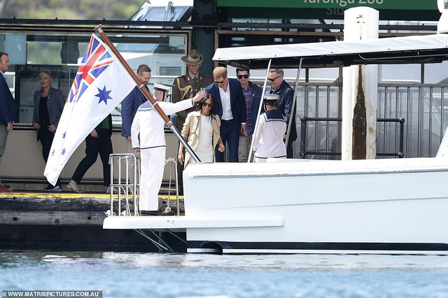 Để di chuyển tới nhà hát Opera Sydney, cặp đôi đã di chuyển bằng tàu của hải quân Hoàng gia Australia sau chuyến thăm sở thú Taronga. (Ảnh: MP)