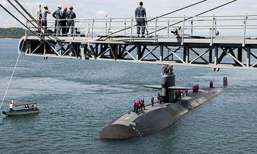Tàu ngầm tấn công USS Jacksonville tiếp cận tàu hậu cần USS Emory S. Land tại Sepanggar, Malaysia. Ảnh: US Navy.