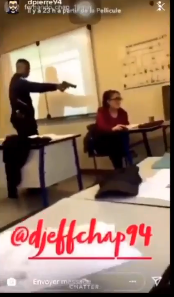 Đoạn video mới được đăng trên Snapchat cho thấy một nam sinh đứng giữa lớp và đe dọa giáo viên bằng một khẩu súng trong lớp học ở Creteil, ngoại ô phía đông nam thủ đô Paris, Pháp, theo RT. Nam sinh yêu cầu cô giáo phải viết "có mặt" thay vì "vắng mặt" trong danh sách điểm danh.