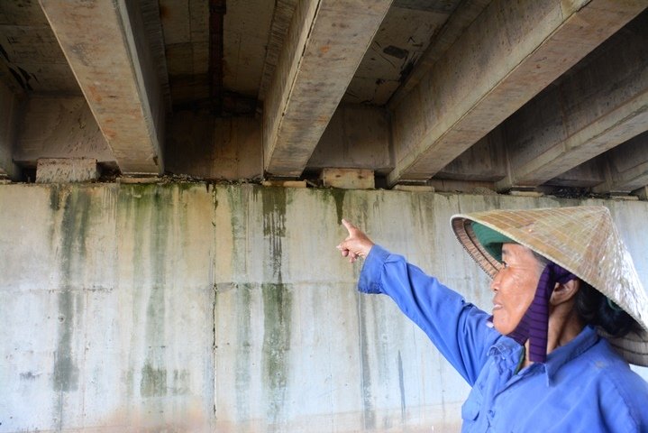 “Mỗi khi trời mưa, hai phía chân cầu nước chảy xuống thành dòng. Nước từ trên mặt đường thấm xuống dầm cầu chui, chảy lênh láng. Riêng đoạn giữa chân cầu, nước chảy thành dòng nhỏ, mỗi khi người dân đi qua thì nước chảy trên đầu”, bà cho hay.