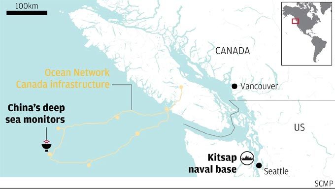 Vị trí ONC cho lắp đặt và kết nối các thiết bị giám sát dưới nước của Trung Quốc rất gần căn cứ tàu ngầm hạt nhân Kitsap của Mỹ. Ảnh: SCMP