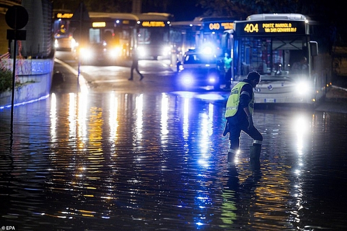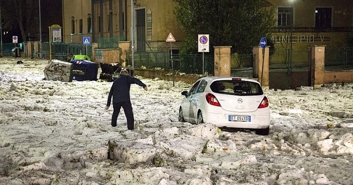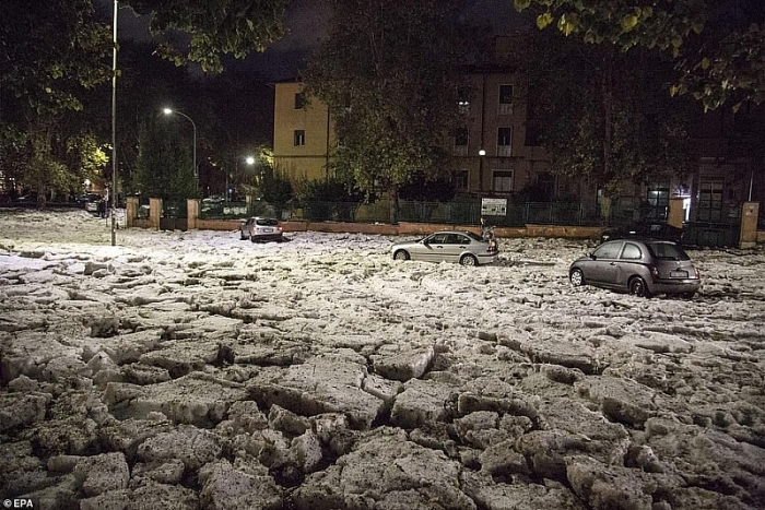 Đường phố ngập lụt, có nơi nước dâng cao tới 1 mét sau khi một trận mưa đá lớn trút xuống nhiều thành phố ở Italia hóa sông băng làm nhiệt độ đột ngột giảm 10 độ, khiến người dân phải trải qua hiện tượng thời tiết khắc nghiệt gồm mưa đá, lũ lụt và gió lốc.