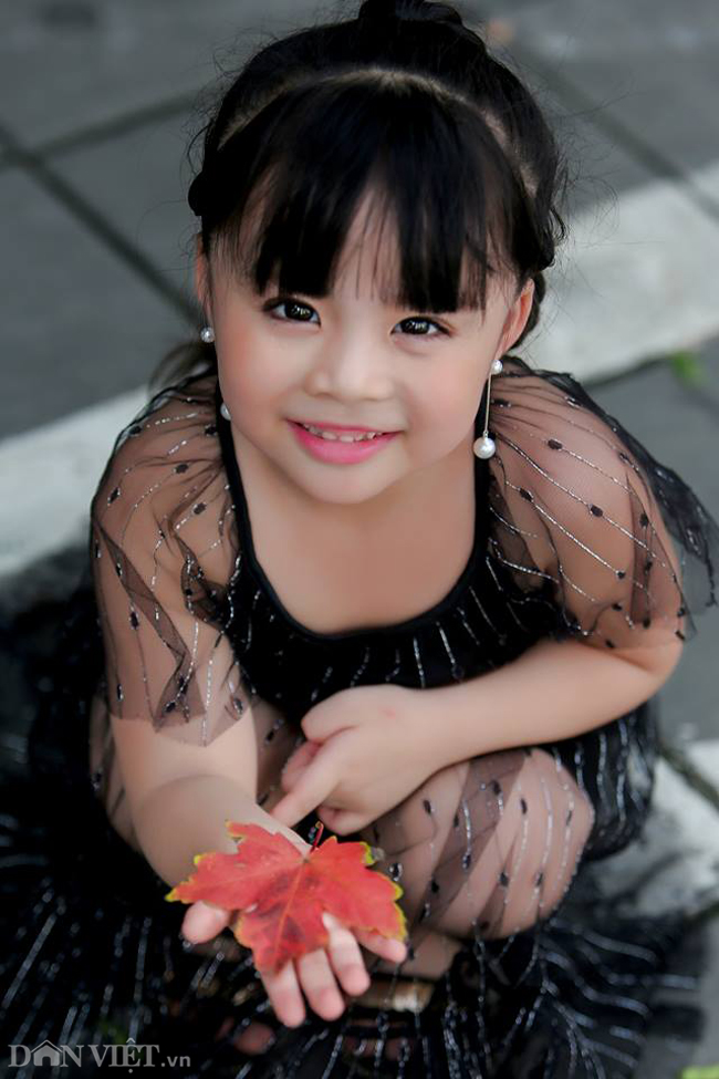 Một em bé thích thú với chiếc lá phong đỏ nhặt trên đường Láng Hạ.