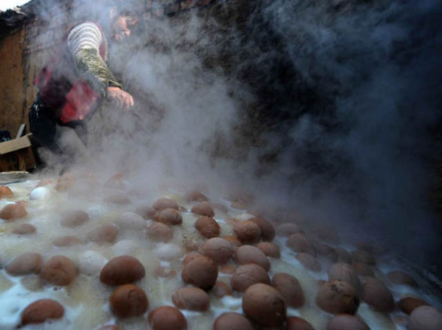 Sau công đoạn ngâm trong nước tiểu, người ta sẽ nấu sôi chúng trong nhiều giờ liền, sau đó bóp vỏ cho nứt và cho vào nồi đun lại. Người nấu liên tục đổ nước tiểu vào nấu để trứng được thấm, thành phẩm cuối cùng là nhưng quả trứng có vị mặn và mùi rất thơm.