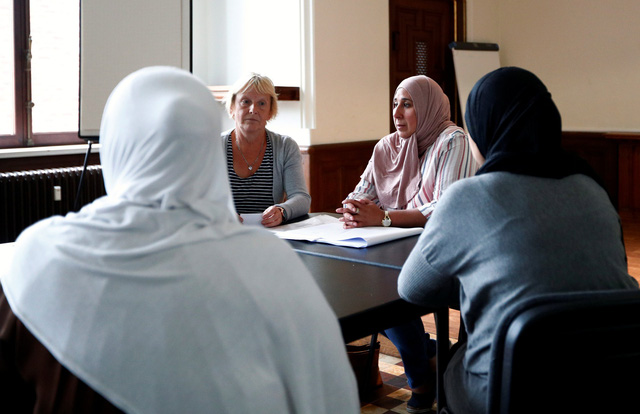 Các nhân viên của tổ chức Mothers' Jihad, tổ chức hoạt động nhằm hồi hương các phụ nữ và con cái đang ở trại tập trung ở Syria trao đổi với 2 bà mẹ người Bỉ có con gái đi theo tiếng gọi IS (2 người giấu mặt) (Ảnh: Reuters)