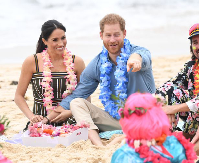 Meghan và Harry tới bãi biển Bondi của Sydney vào ngày thứ tư của chuyến công du với vòng hoa quanh cổ và trang phục giản dị. Nữ công tước đi chân trần và để cho bàn chân của mình chìm vào trong cát khi cô tham gia một hoạt động cùng nhóm người địa phương.