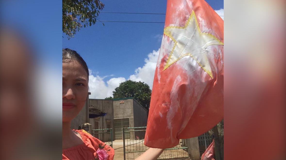 Một nhà hoạt động chụp ảnh bên chiếc cờ đỏ sao vàng bị bôi bẩn. Nhà cầm quyền CSVN cáo buộc cô tội "xúc phạm quốc kỳ". Mới đây Viện kiểm sát ND tỉnh Đăk Lăk đã triệu tập nhà hoạt động này.