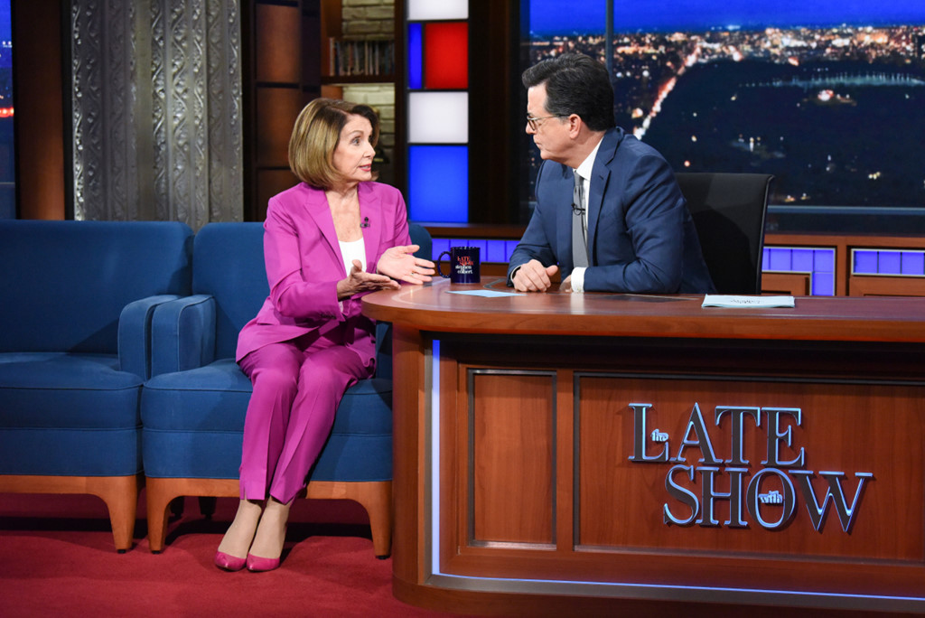 Bà Nancy Pelosi, lãnh đạo phe Dân chủ ở Hạ viện, xuất hiện trên chương trình talkshow của Stephen Colbert và rất tự tin vào một chiến thắng trong cuộc bầu cử lần này. Ảnh: CBS