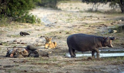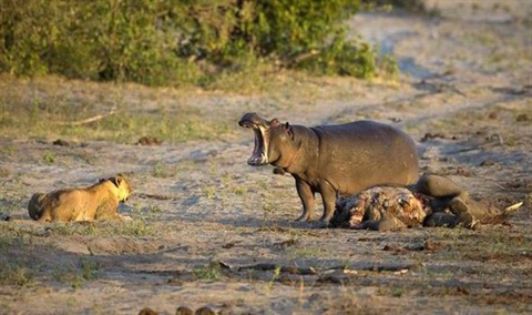 Sư tử chỉ có thể ngồi nhìn hà mã ăn con mồi của mình.