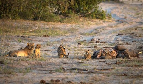 Mẹ con sư tử kiên nhẫn ngồi chờ hà mã ăn xong và đến khi nó trở lại sông, một phần xương thịt thừa được chừa lại cho mẹ con sư tử.