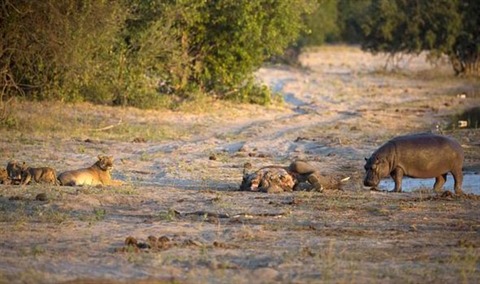 Chùm ảnh được Grant Atkinson chụp tại bờ sông Chobe ở Botswana đã chứng minh điều này khi một con hà mã đơn độc chống lại cả mẹ con sư tử để bảo vệ bữa ăn của mình là xác một con voi con.