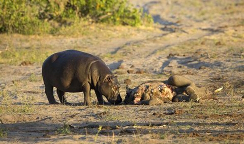 Hà mã và sư tử mẹ cùng tranh nhau ăn xác của voi con.